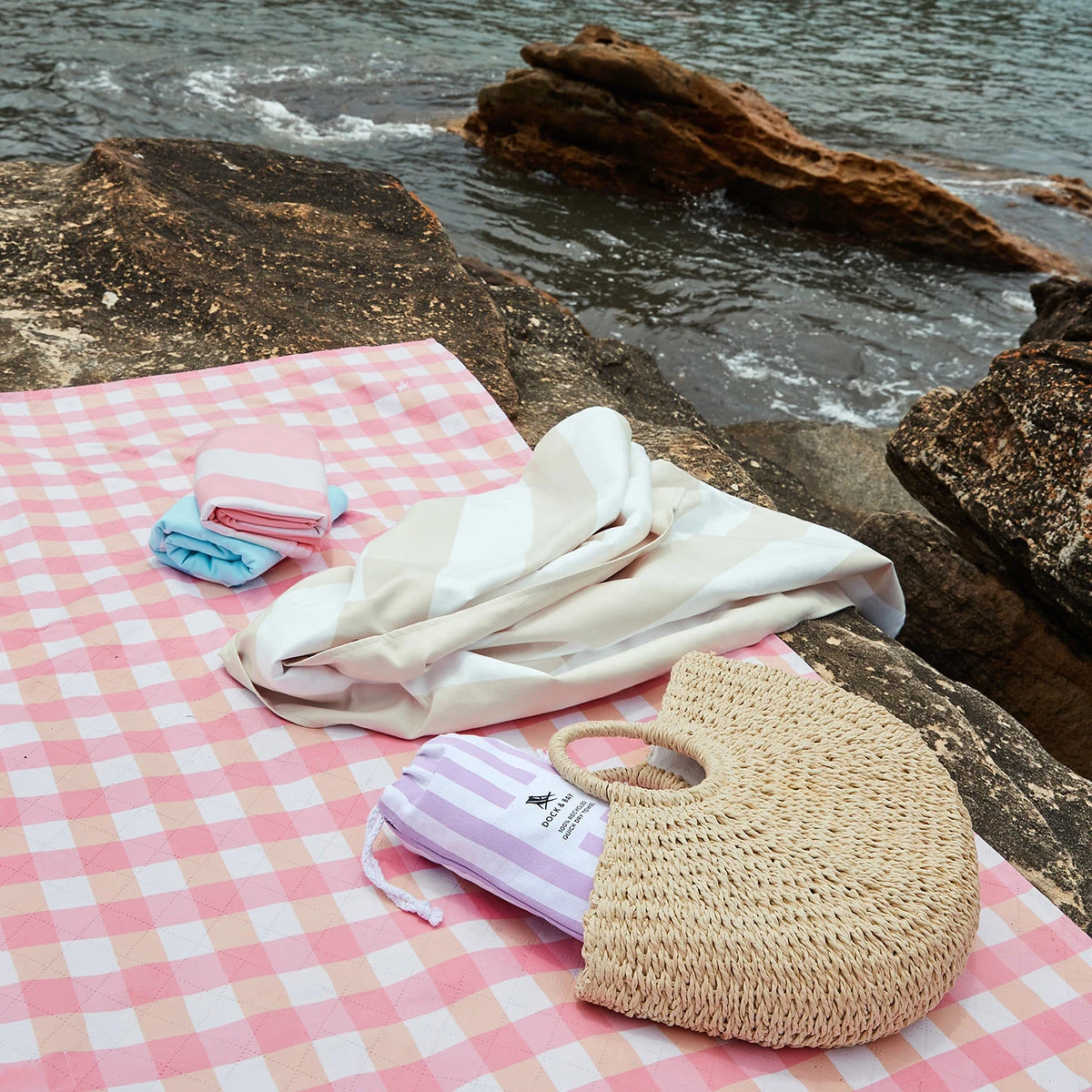This bundle includes an Extra Large Picnic Blanket (Strawberries & Cream), and 4 individually packed quick dry beach towels in the following styles: Goa Grey, Tulum Blue, Malibu Pink, Lombok Lilac. All towels and blanket includes their own handy travel pouch.
